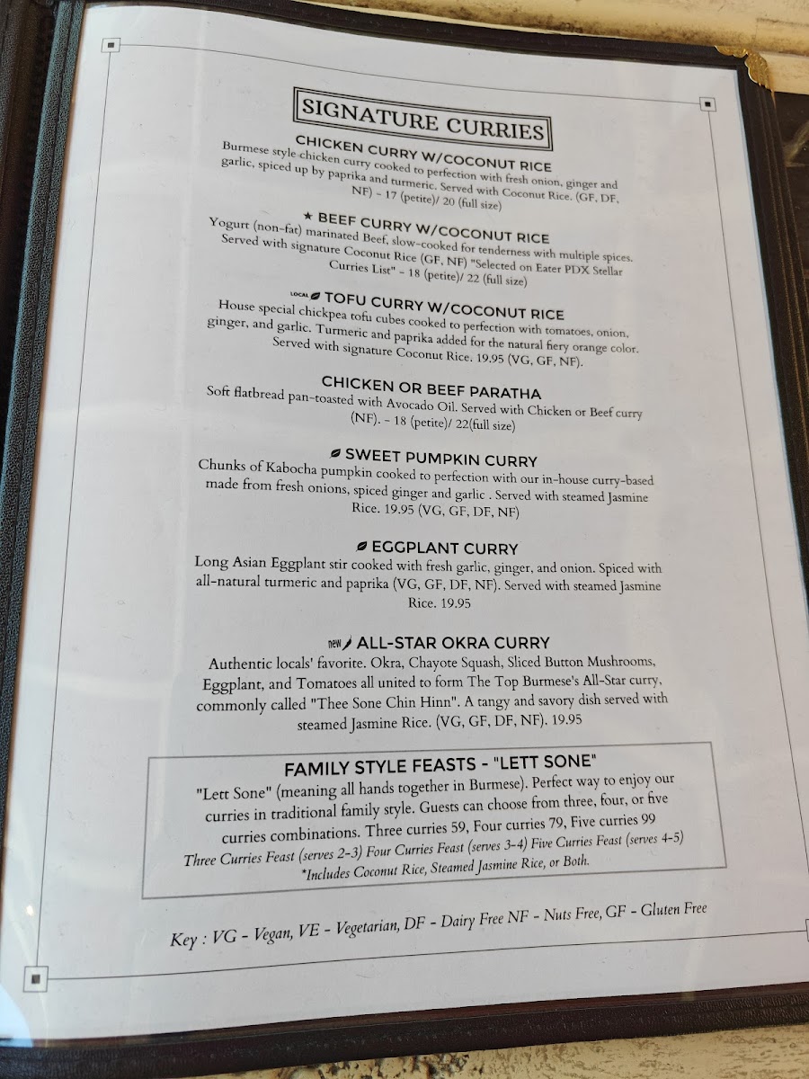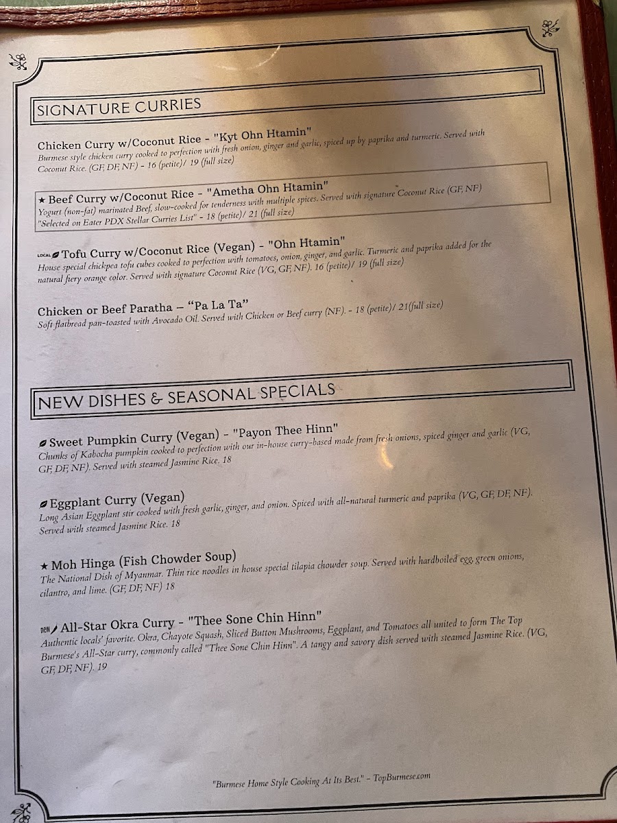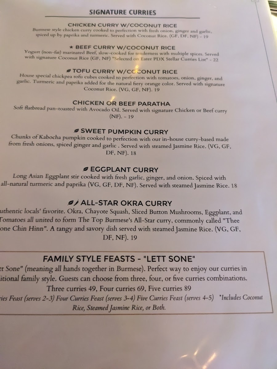 Authentic locals' favorite. Okra, Chayote Squash, Sliced Button Mushrooms, Eggplant, and Tomatoes all united to form The Top Burmese's All-Star curry, commonly called "Thee Sone Chin Hinn". A spicy, tangy, and savory dish served with steamed Jasmine Rice. (VG, GF, DF, NF).