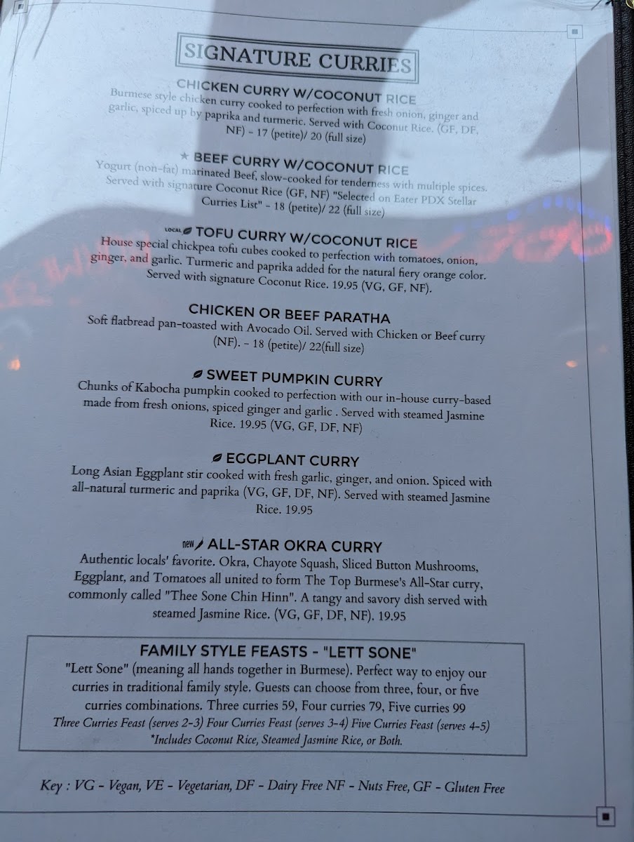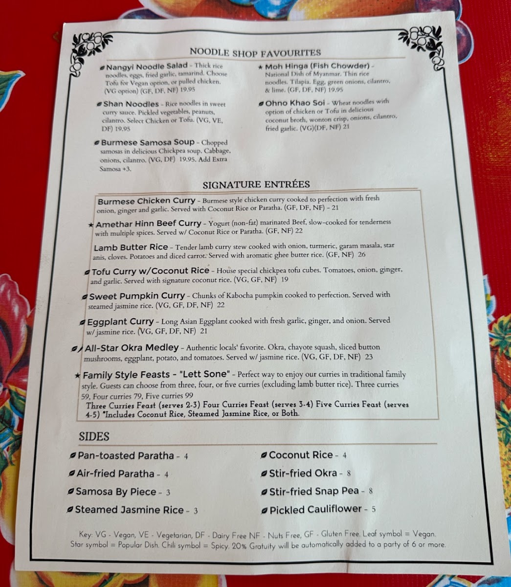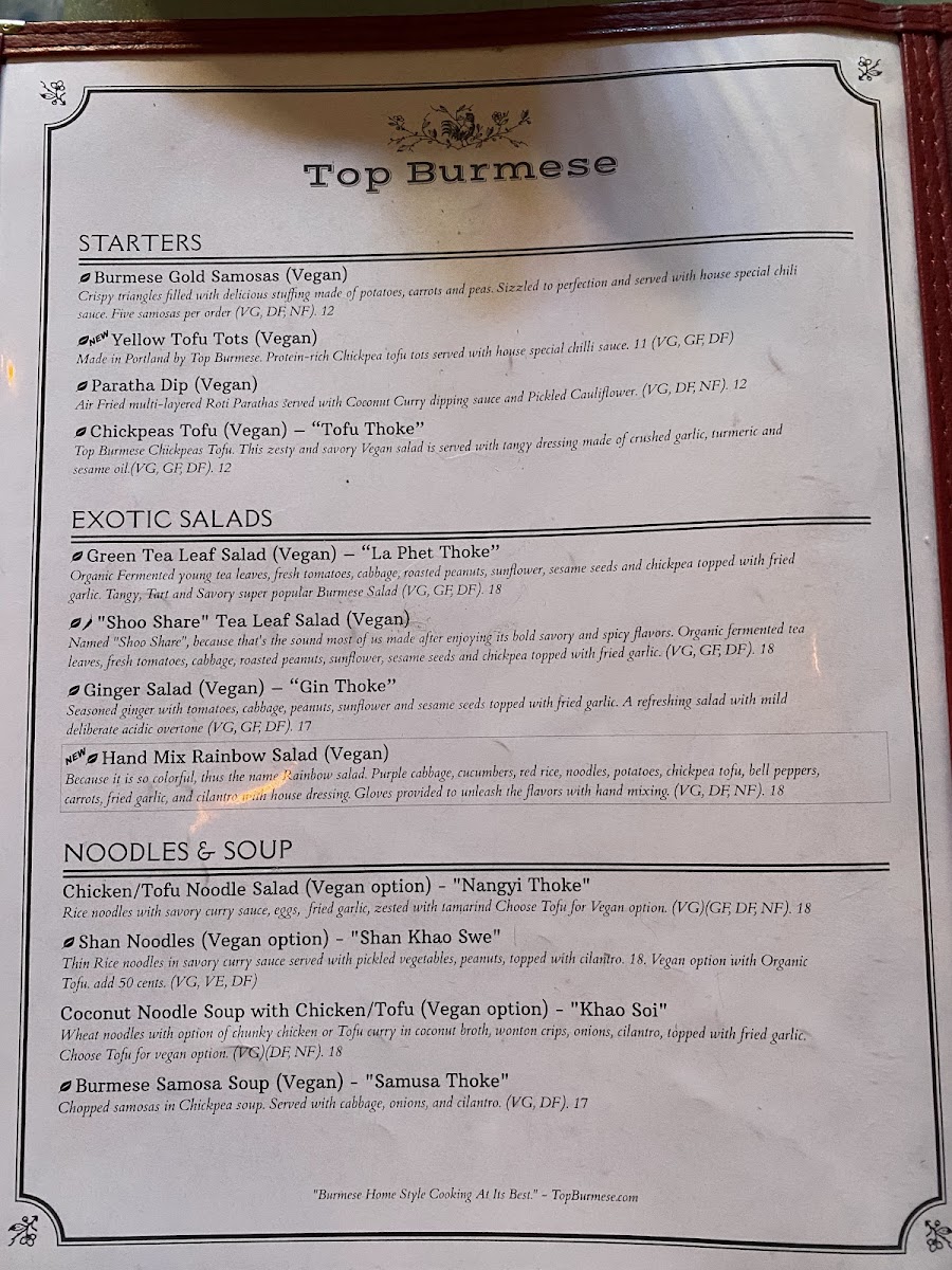 Authentic locals' favorite. Okra, Chayote Squash, Sliced Button Mushrooms, Eggplant, and Tomatoes all united to form The Top Burmese's All-Star curry, commonly called "Thee Sone Chin Hinn". A spicy, tangy, and savory dish served with steamed Jasmine Rice. (VG, GF, DF, NF).